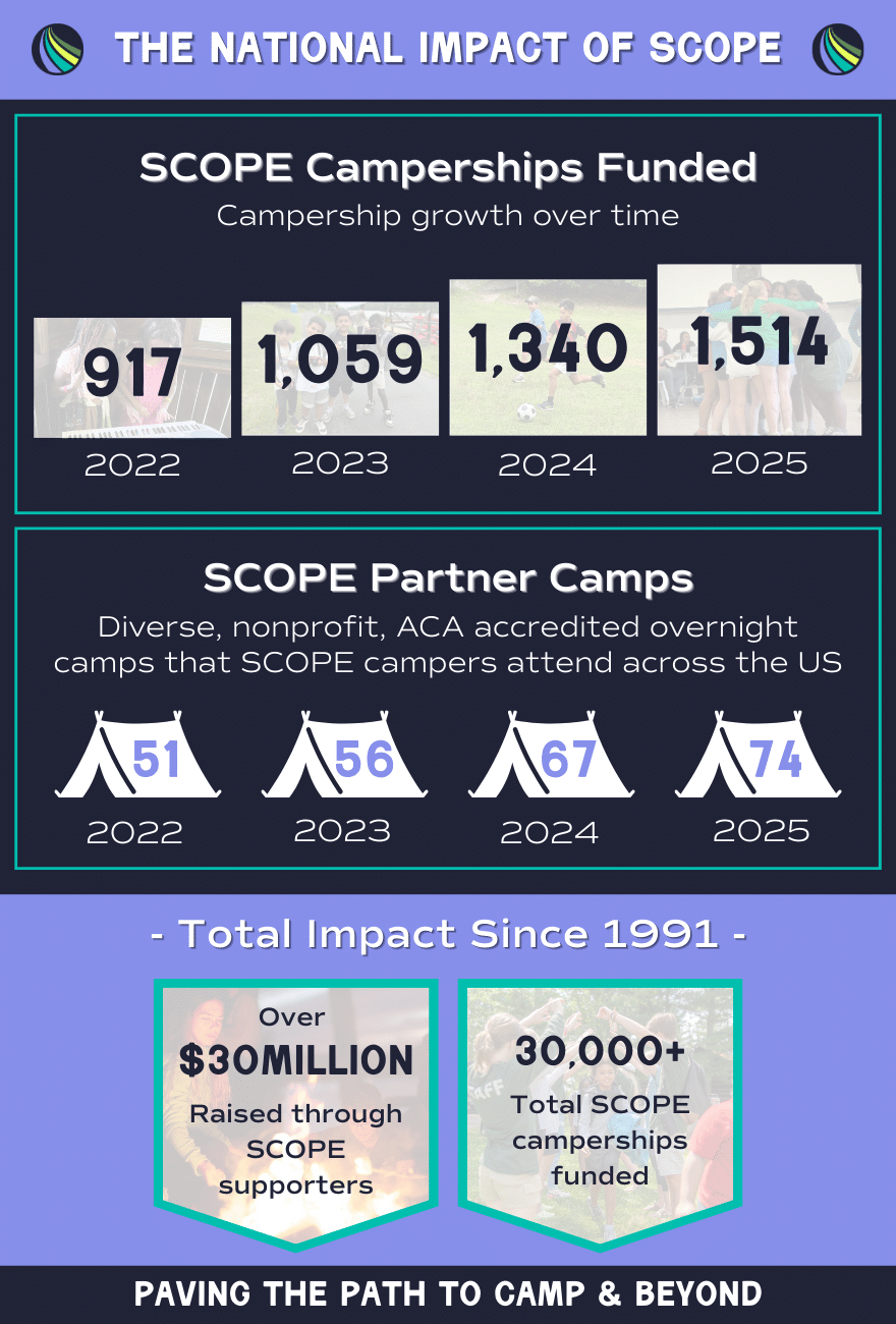In 2025, SCOPE is partnering with 74 different nonprofit, overnight summer camps around the United States, accredited by the American Camp Association (ACA).